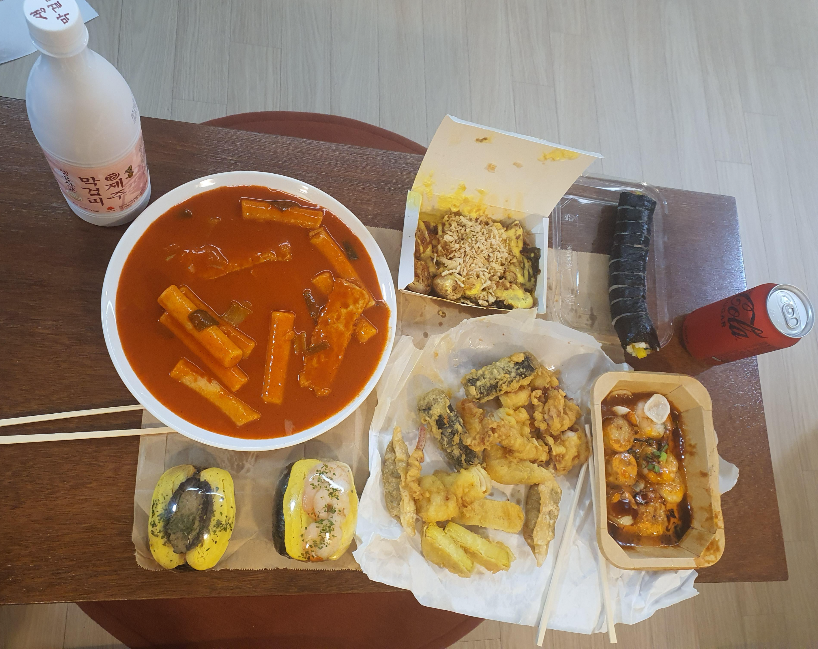 그래서 분식집에서 떡볶이 + 모둠튀김 + 김밥 세트도 함께 포장해왔어요!