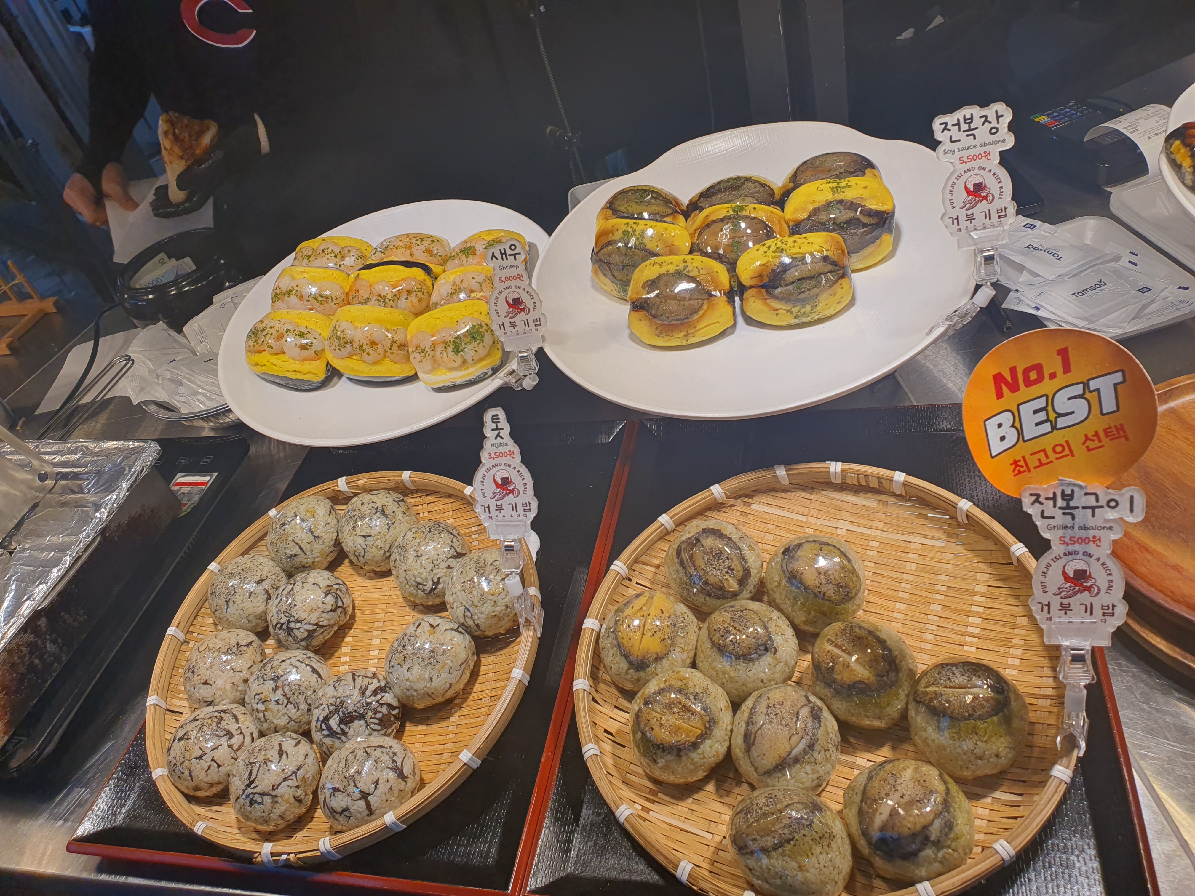 동글동글한 주먹밥 위에 전복장이랑 새우가 올려져 있는 비주얼 끝판왕🤩